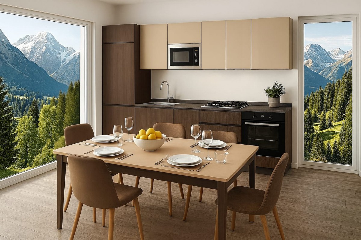 La cucina è fornita di serie con piano cottura a 5 fuochi, ma può essere sostituito con piano in cristallo oppure con un piano cottura ad induzione, con adeguamento della cappa aspirante compatibile (disponibile con supplemento promozionale).